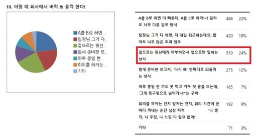 뿐만 아니라 ‘당신이 생각하는 야근의 기준’에 대해 ‘업무 시간 이외의 근무는 무조건 야근’이라는 명쾌한 답변과 ‘최악의 동료’에 대해 ‘뺀질거리면서 일 적게 하는 동료’, ‘가장 피하고 싶은 회식’으로 ‘N차까지, 끝을 모르는 회식’ 등 사회생활을 한 번이라도 해 본 사람이라면 공감 가능한 재치 있는 답변들이 1위로 선정되어 공감대를 형성한다. 이처럼 다양한 설문 결과들은 마치 어제, 오늘 내가 직장에서 겪은 일들과 묘하게 겹치며 웃음을 전한다. 특히 상사들에게만 해당하는 문항인 ‘아래 사람에게 듣기 싫은 말’에는 부하직원들의 냉정한 답변, ‘제 일 아닌데요’가 39%를 차지해 상사들이 느끼는 답답한 마음까지 대변, 통쾌한 재미를 선사한다.
