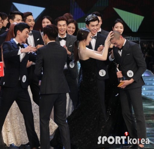28일 오후 서울 강서구 등촌동 SBS 공개홀에서 열린 `2015 슈퍼모델선발대회`에 참가해 대상을 차지한 19번 손기성과 9번 김형우가 동료드르이 축하를 받고 있다.