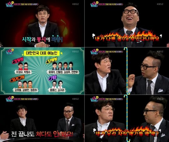 이날 방송에서 이경규와 박명수는 초반부터 소리를 버럭 지르며 신경전을 벌였다. 이경규는 “오늘 내가 지면 치명적이다. 오늘 굉장히 좌불안석”이라고 털어놨다. 박명수는 “35년 된 이경규는 이제 떠나야 한다. 언제까지 이경규식 호통 개그에 매달려 있을 것이냐”고 강력하게 어필했다.