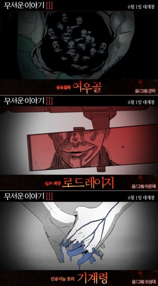 영화 ‘무서운 이야기 3: 화성에서 온 소녀’가 오는 6월 1일 개봉을 앞두고 스페셜 웹툰을 최초 공개해 뜨거운 반응을 얻고 있다. ‘무서운 이야기 3: 화성에서 온 소녀’는 살아서는 빠져나갈 수 없는 여우골의 전설을 담은 공포 설화 ‘여우골’, 멈추지 않는 공포의 속도감을 보여줄 질주 괴담 ‘로드레이지’, 아이와 인공지능 로봇의 지킬 수 없는 무서운 약속을 그린 인공지능 호러 ‘기계령’까지 과거, 현재, 미래 시간을 초월한 절대 공포를 담은 작품이다.