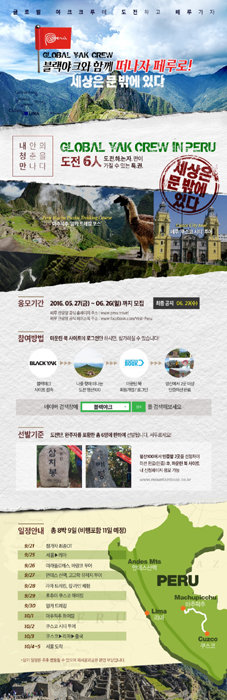 글로벌 아웃도어 브랜드 블랙야크가 안데스의 광활한 자연과 잉카인의 신비로운 문명을 체험하는 ‘세.문.밖 떠나자! 글로벌 야크 크루’의 페루행 도전자를 모집한다. 선정된 총 6명은 9월25일부터 10월3일까지 8박 9일간의 일정으로 페루 여행을 떠난다. 수도 리마의 신시가지 지역인 미라플로레스와 최근 주목받는 지역인 바랑코 투어를 시작으로 안데스산맥 고고학 유적지 투어, 라마트레킹, 잉카 트레킹, 마추픽추 하이킹, 쿠스코 시티투어 등에 참여한다. 5월27일부터 6월26일까지 블랙야크 아웃도어 정보 포털 마운틴북(www.mountainbook.co.kr) 회원 가입 후 미션에 도전하면 된다. 미션은 전국 100대 명산에 올라 인증사진을 찍는 것으로 블랙야크 마운틴북의 대표 챌린지 프로그램인 ‘명산100’에 참여하고 명산 2곳을 선정해 정상 등정에 도전하면 된다.