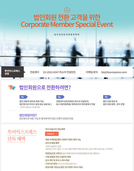 SM C&C 투어익스프레스는 기업법인 고객 대상 혜택을 강화한다. 법인회원은 투익 마일리지 적립, 기업 전담 컨설턴트, 제휴 마케팅을 통한 다양한 이벤트, 삼익면세점 1만원 선불카드 및 VIP카드 발급, 회원등급 업그레이드, 기프티콘 증정, 항공사별 기업요금 할인 및 서비스 제공 등의 혜택을 누릴 수 있다. SM C&C 투어익스프레스는 비즈니스 클래스 전용 센터, 해외출발 전용 센터 등 전문 서비스를 제공하고 있다.