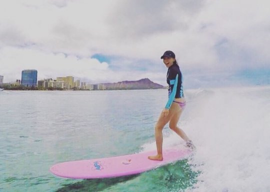 공개된 사진 속 야노시호는 핑크 컬러의 롱 서핑 보드를 이용해 파도를 타는 모습으로 시선을 끈다. 물살을 가르는 와중에도 안정적인 포즈, 밝은 미소의 여유 있는 모습으로 수준급의 서핑 실력을 짐작케 한다