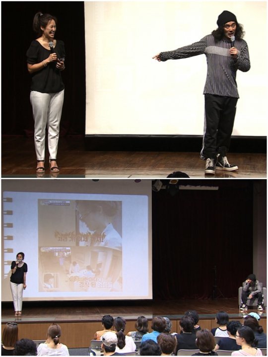 특강이 시작되자 남편 최민수, 아들 유성이 유진이와 함께 무대에 오른 강주은은 객석으로 내려가는 최민수를 붙잡아 무대 위 소파에 앉히며 강의를 시작한다.