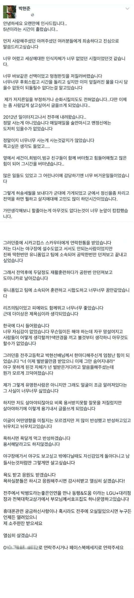 박현준은 4일 자신의 페이스북에 “안녕하세요. 오랜만에 인사드립니다. 사랑해주시고 아껴주셨던 여러분들에게 진심으로 죄송하다고 말씀드리고 싶다. 너무 어렸고 세상에 대한 인식 자체가 없었다”고 말문을 열었다.