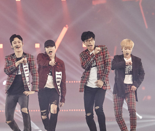 ‘무한도전’은 17일 아이돌그룹 엑소와 함께 한 ‘댄싱 킹’(사진) 특집을 통해 또 한 번의 성공적인 컬래버레이션(협업)을 완성했다. 멤버 유재석은 엑소와 한 달 이상 군무 연습을 하며 11일 태국 방콕 임팩트아레나에서 열린 엑소의 콘서트 무대에 올라 이들과 일체했다. 이들이 함께 부른 ‘댄싱 킹’ 음원은 18일 멜론, 올레뮤직 등 실시간 차트에서 모두 1, 2위에 올랐다.