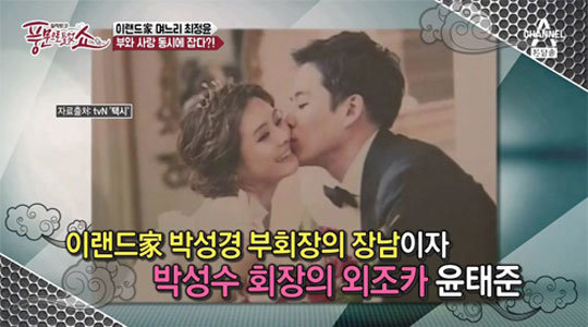 19일 방송된 채널A ‘풍문으로 들었쇼’에서 기자는 “최정윤의 남편이 박성경 부회장의 장남이자 박성수 회장의 외조카인 이글파이브 출신 윤태준이다. 그리고 2011년 결혼 당시 이랜드의 자산 규모가 6조 원대였다”고 밝혔다.