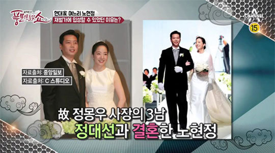 19일 밤 방송된 채널A ‘풍문으로 들었쇼’에서 결혼으로 재벌가에 입성한 연예인에 대한 이야기를 나누던 중 최대웅은 “노현정이 故 정몽우의 3남인 정대선과 결혼을 했다”고 운을 뗐다.