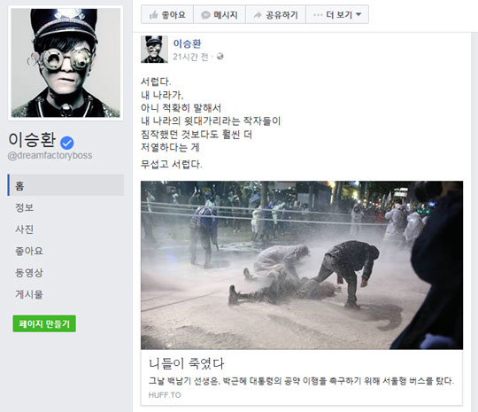 사진|백남기 농민 사망에 분노한 이승환 페이스북