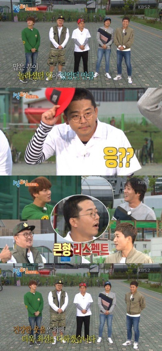 특히 김준호는 모자를 살짝 벗으며 인사했고 부쩍 짧아진 헤어스타일에 모두가 놀랐다. 그는 "잘못하다가 잘랐다"라고 말했지만 멤버들은 믿지 않았다. "큰형 리스펙트"라며 김준호를 추어올렸고 김준호는 분위기에 휩쓸려 무릎을 꿇고 뜻밖의 석고대죄를 펼쳐 웃음을 자아냈다.