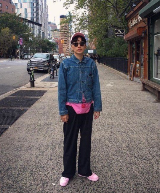 이동휘는 15일 자신의 인스타그램에 미국 뉴욕 여행 중 찍은 사진 한 장을 올렸다. 독특한 패션 스타일이 돋보인다. 이동휘는새 평소 핑크마니아 답게 모자, 상의, 신발을 핑크색으로 깔맞춤했다.