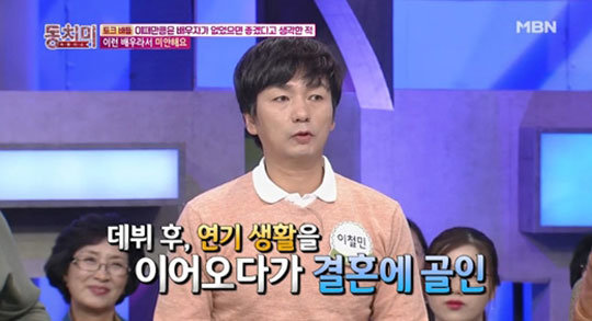 19일 방송된 MBN ‘동치미’에 출연한 이철민은 “내가 주말드라마에서 조연으로 데뷔를 했다. 그러다 결혼을 했는데 나가는 생활비는 늘어나고, 작품은 들어오지 않더라. 몇 달씩 쉬게 되는 상황이었다”며 입을 열었다.