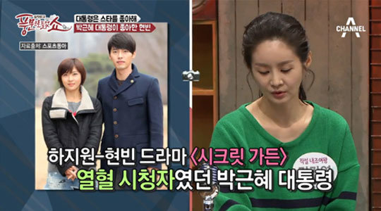이에 김가연은 “그럴 수밖에 없는 게, 박근혜 대통령이 현빈과 하지원이 출연한 드라마 ‘시크릿 가든’의 정말 열렬한 팬이었다더라. 그리고 박근혜 대통령 본인이 차움의원에서 진료할 때도 가명을 길라임이라고 쓸 정도였다고. 간호사들이 지어준 거라고 주장하고 있지만 어쨌든 그 정도로 열렬한 팬이었으니까. 그리고 어떤 인터뷰에서 ‘요즘 남자 탤런트 중에 누가 젤 좋으냐?’니까 ‘현빈’이라고 하는 걸 내가 봤거든”이라고 덧붙였다.
