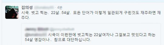 앞서 한 누리꾼은 “시국이 이런 판에 벗고 찍는 22살 여자나 그걸 보고 멋있다고 하는 54살 영감이나. 참으로 대단하십니다”라며 김의성을 비판했다. 누리꾼은 설리의 SNS 기행에 대해 칭찬한 김의성의 행동을 비꼰 것이다.