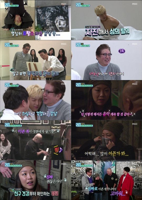 이어 거꾸로 보는 미술 작품들이 강남을 더욱 난감하게 만들었다. 작가가 물구나무서기를 제안한 것. 강남은 홀린 듯 물구나무를 섰고, 작가의 손에 매달린 채 작품을 감상해 시청자들을 빵 터지게 만들었다. 그는 얼굴이 새빨개지면서까지 힘들게 작품을 감상하면서도 미술을 좋아하는 김용건을 위해 함께 즐기려고 노력해 눈길을 끌었다.