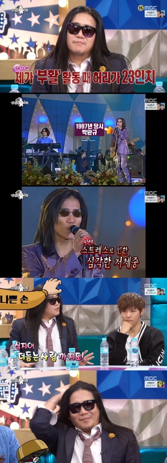 박완규는 “부활 활동 당시 23인치였다”며 “김태원도 내 건강을 걱정할 정도였다. 당시 45kg이었다”고 말했다.