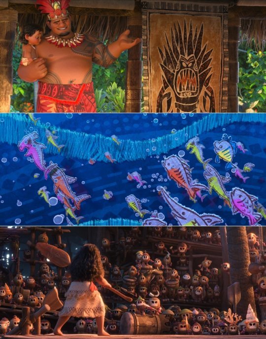 ‘모아나’에는 수작업과 3D 애니메이션을 절묘하게 조화한 장면이 많다. 그 중 단연 압권으로 꼽히는 것이 반신반인 ‘마우이’가 ‘You’re Welcome’을 부르는 장면이다. 쏟아지는 코코넛 열매와 야자수 등 수작업으로 그려진 그림을 감상하는 즐거움 사이에서, 어디서 많이 본 물고기떼가 등장한다. 바로 ‘모아나’를 연출한 론 클레멘츠&존 머스커의 전작인 ‘인어공주’에 등장했던 넙치떼. 작고 납작한 넙치떼들이 ‘마우이’를 따라 ‘You’re Welcome’을 부르며 헤엄치는 아기자기한 장면이 오랜 디즈니 팬들의 향수를 자극한다.