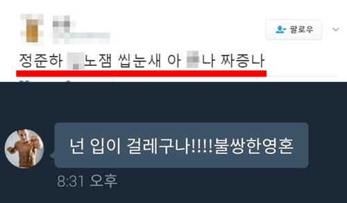 해당 트위터 이용자는 앞서 ‘정준하 X 노잼 X눈새 아 X나 짜증나’라는 트윗을 게재했고 정준하는 자신의 이름을 검색하다가 해당 트윗을 발견하고 쪽지를 보낸 것으로 추정된다.