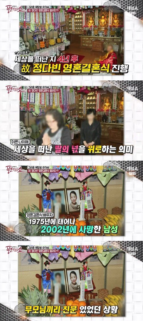 이어 또 다른 기자는 “정다빈이 세상을 떠난 지 4년 후였다. 2011년이었다. 이른 나이에 세상을 떠난 딸의 넋을 위로하는 의미로 어머니가 준비했다고 하더라”며 “알려진 바에 따르면 1975년도에 태어나서 2002년도에 사망한 문모 씨라는 분이고, 부모님끼리 서로 잘 아는 사이라고 한다”고 덧붙였다.