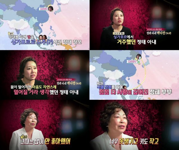 이날 오정태의 아내 아영 씨는 “집에서 남편과의 결혼 반대가 너무 심했다. 그 당시 남편과 헤어지길 바라는 마음에 엄마가 나를 싱가포르에 오랫동안 여행을 보냈다”고 말문을 열었다. 이어 “엄마는 몸이 멀어지면 자연스레 마음도 멀어질 거라고 생각하셨던 것 같다. 한 달간 싱가포르에 거주했는데, 그때 국제전화를 하면서 남편과의 사랑이 점점 더 깊어졌다”면서 결혼에 골인하게 된 이유를 밝혔다.