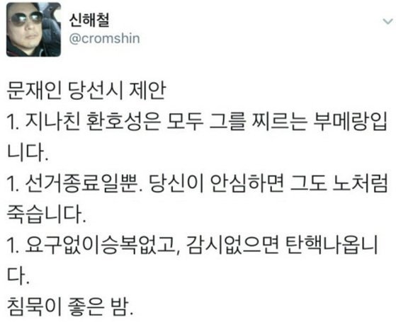 “지나친 환호성은 모두 그를 찌르는 부메랑입니다. 선거종료일 뿐, 당신이 안심하면 그도 故 노무현 전 대통령처럼 죽습니다. 요구 없이 승복 없고, 감시 없으면 탄핵 나옵니다”라며 승리에 도취되지 말고 끊임없이 응원을 하자고 말했다.
