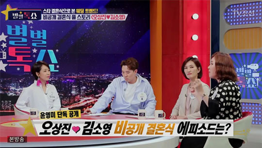‘별별톡쇼’ 방송인 윤영미가 오상진♥김소영 아나운서의 비공개 결혼식 관련 에피소드를 전했다.