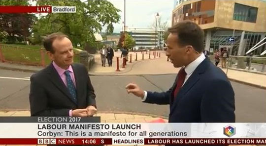 벤 브라운은 잉글랜드 웨스트요크셔카운티 브래드퍼드의 거리에서 생방송으로 총선과 관련한 이야기를 진행했다.