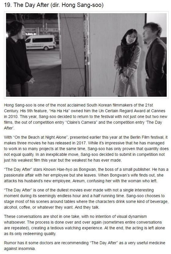 12일(현지시간) 이 매체는 홍 감독에 대해 “21세기 최고의 영화 제작자 중 한명”이라고 소개하면서도 ‘그 후’에 대해서 “1시간 30분 동안 단 한 번의 재미있는 순간으로 만들어진 가장 힘든 영화 중 하나”라고 비평했다.