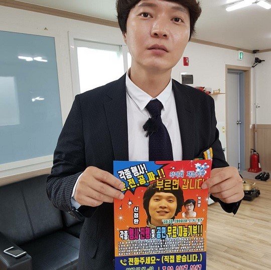 공개된 사진에는 ‘각종 행사, 완전 공짜! 부르면 갑니다. 무료 재능 기부’라고 적힌 전단지를 든 신정환의 모습이 담겼다.