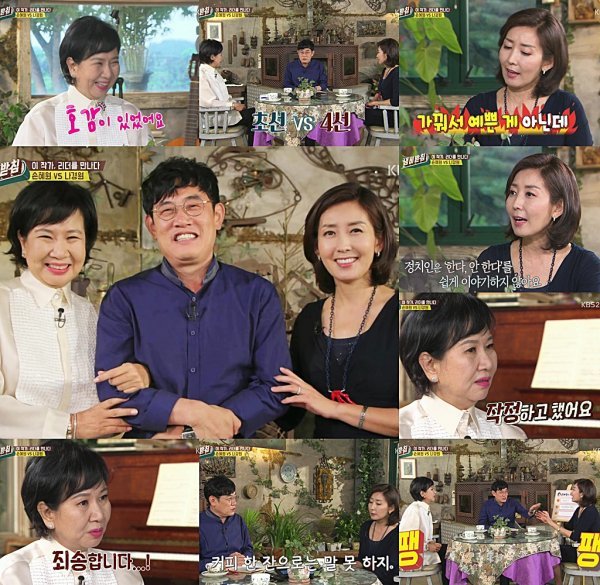두 사람은 이슈메이커답게 사과도 화끈했다. 손 의원은 위안부 할머니 빈소에서의 기념촬영으로 인한 논란에 깔끔하게 사과를 했고, 청문회 중 “닥치세요”라고 말한 것은 “작정한 것”이라고 밝혔다. 나 의원이 “싸우지 말고 화해했으면 좋겠다”고 충고하자 손 의원은 “선배의 말을 참고하겠다”고 말했다. 이어 나 의원은 조국, 원희룡, 김난도 등 서울대 82학번 동기 중 썸을 탄 사람을 묻는 질문에 “커피 한 잔으로는 말 못 한다”며 예능감을 과시했다.