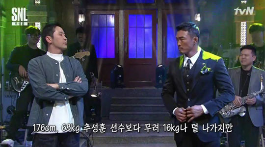 이어 "176cm, 68kg으로 추성훈보다 무려 16kg이나 덜 나가지만 옛 말에 작은 고추가 맵다는 속담도 있지 않냐"라고 말을 이어나간 정상훈.
