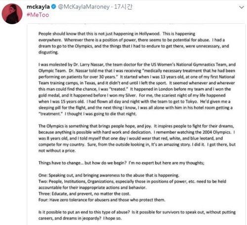 체조 금메달리스트 맥카일라 마로니(21)가 13살 때부터 팀 닥터에게 성추행을 당했다고 밝혔다.