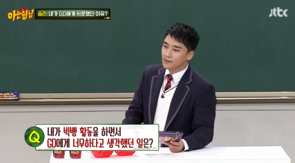 이날 승리는 “빅뱅 활동을 하면서 리더 GD에게 너무하다고 생각했던 일은?”이라는 퀴즈를 냈다. 정답은 바로 아플 때 참으라고 한 말이다.