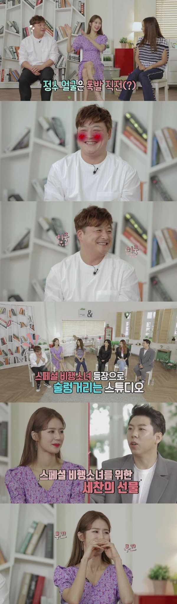 이에 여성 멤버들은 "왜 이렇게 수줍어하세요?" "얼굴이 너무 빨갛다" "얼굴 좀 식혀야 될 것 같다. 폭발 직전이다" "광대가 승천했다"라고 그를 놀려댔다.