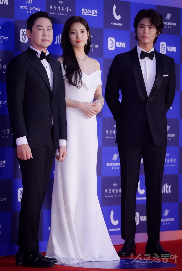 개그맨 신동엽과 가수 겸 배우 수지, 박보검(왼쪽부터)이 3일 서울 강남구 삼성동 코엑스 D홀에서 열린 ‘2018 백상예술대상’ 시상식 레드카펫 행사에 참석해 포즈를 취하고 있다.