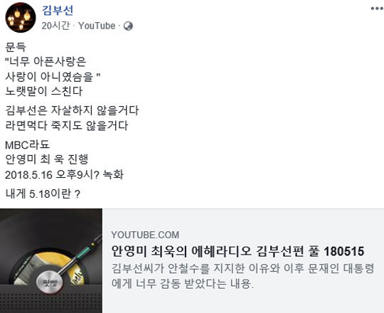 김부선은 25일 SNS에 “문득 ‘너무 아픈 사랑은 사랑이 아니었음을’의 노랫말이 스친다”며 “김부선은 자살하지 않을 거다. 라면 먹다 죽지도 않을 거다”라고 썼다. 그는 지난 5월 녹화한 MBC 표준FM ‘안영미 최욱의 에헤라디오’ 방송분을 링크했다.