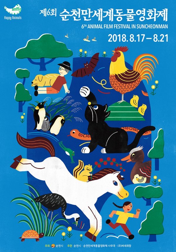 일러스트로 제작된 이번 포스터는 자연과 동물, 그리고 인간이 서로 연결되어 있음을 한 장의 일러스트에 담아내 눈길을 사로잡는다. 포스터는 블루를 메인 컬러로 채색해 여름날에 열리는 영화축제의 시원한 청량감을 강조하는 동시에, 초록, 주황, 노랑 등 원색의 컬러로 자연의 생동감을 선사한다. 포스터의 배경으로 생태도시 순천을 상징하는 순천만의 둥근 갈대숲과 S자로 굽이쳐 흐르는 강물, 순천만국가정원, 순천만 습지 등 순천의 자연친화적인 모습을 심플하게 상징화 했다. 순천의 상징적 공간을 자유롭게 누비는 사람과 동물, 모든 생명이 한데 어우러진 모습을 형상화해 “Happy Animals - ‘함께’ 행복한 세상”이라는 올 해 슬로건에 담긴 생명존중의 스토리텔링을 완벽히 재현했다.