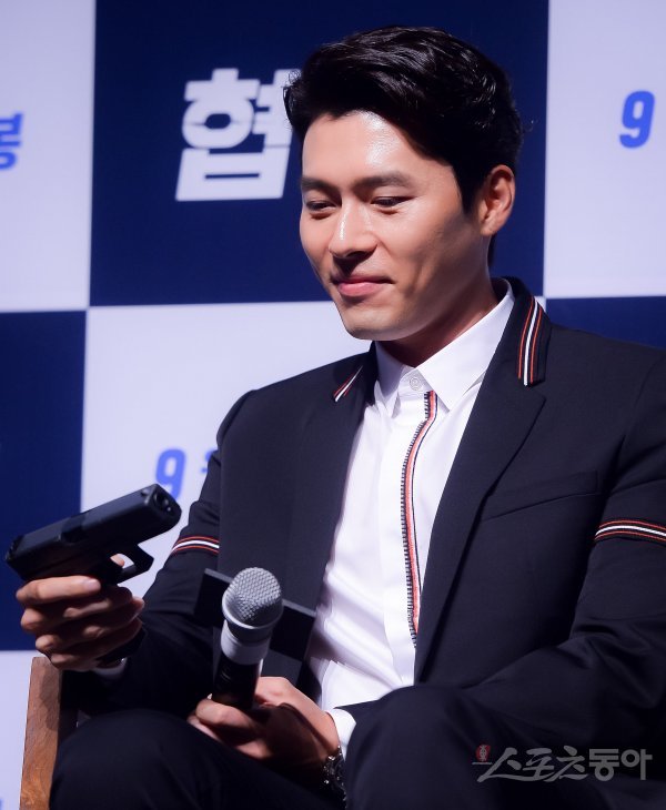 배우 현빈이 9일 서울 강남구 압구정로에 위치한 CGV 압구정에서 열린 영화 ‘협상’ 제작보고회에서 영화 소품인 권총을 바라보고 있다.