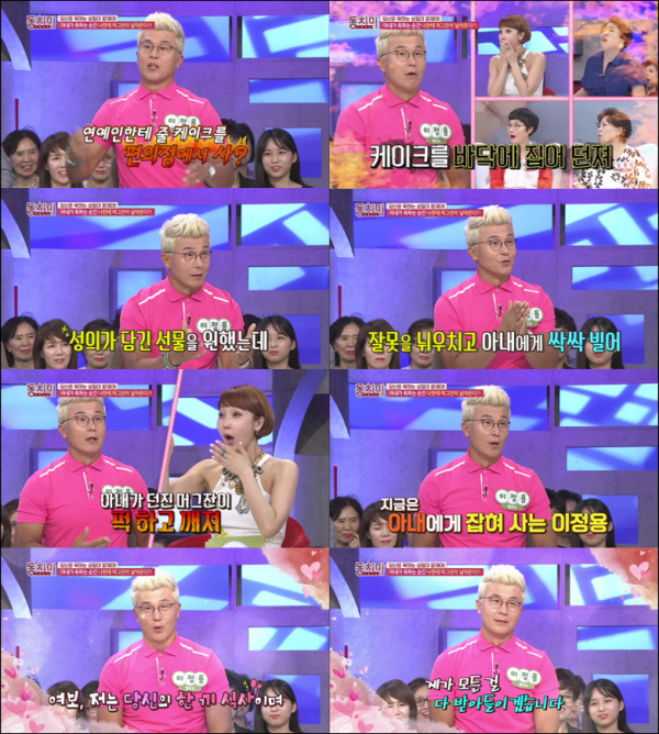 이어 “순간 욱해서 내가 연예인인데 케이크를 편의점에서 사냐며 바닥에 집어던진 뒤 이럴 거면 나를 만나지 말라고 하고 가버렸다”라고 덧붙이며 모두를 충격에 빠뜨렸다. 이에 이정용은 “케이크의 가격을 떠나 성의가 담긴 선물을 원했는데 편의점에서 사는 건 누구나 할 수 있다고 생각했다. 나중에 욱한 게 죄스러워 아내에게 싹싹 빌었다”라며 결혼 전 아내와의 일화를 전했다.