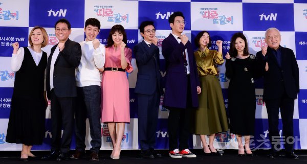 1일 서울 마포구 상암동 CJ E&M CENTER에서 tvN ‘따로 또 같이’ 제작발표회에 출연진들이 참석해 포토타임을 갖고 있다. 왼쪽부터 박미선-이봉원 부부, 김가운-강성연 부부, 개그맨 김국진, 최원영-심이영 부부, 최명길-김한길 부부.