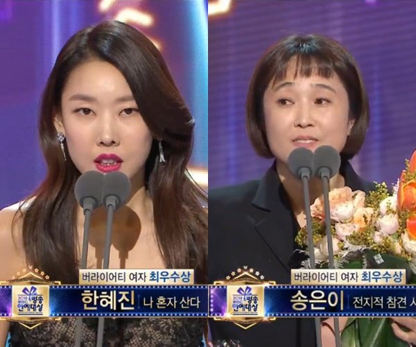이날 최우수상을 받은 한혜진은 “감히 어떻게 송은이 선배님과 이 무대에 서서 상을 받을 수 있는지, 감개무량하다는 생각밖에 안 든다”며 “시청자 여러분들에게 가장 감사하다는 말씀을 드리고 싶다. 고민이 많을 때 항상 내 고충을 옆에서 들어주는 전현무 씨와 이 기쁨을 함께 하고 싶다”고 말했다.