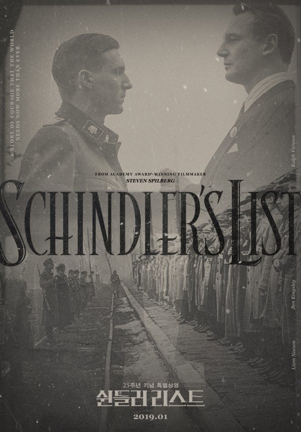 유태인 회계사 스턴과 가까워지면서 마침내 강제 노동 수용소로부터 유태인들을 구하기로 결심한 오스카 쉰들러의 “한 생명을 구하는 건 온 세계를 구하는 겁니다”라는 묵직한 한마디는 “잔혹한 시대와 맞선 한 사람의 위대한 용기. 2019년 그 감동을 다시 만나다. 결코 잊어선 안 될 이야기”라는 문구와 더불어 새해 우리가 꼭 보아야 할 영화의 등장을 알린다.