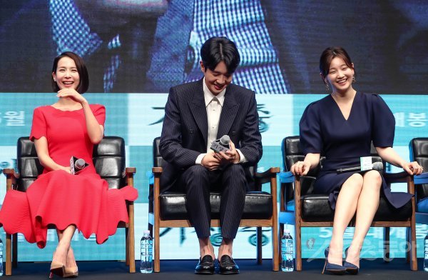 배우 조여정과 최우식, 박소담(왼쪽부터)이 22일 서울 중구 소공동 웨스틴 조선호텔 서울 그랜드볼룸에서 열린 영화 ‘기생충’ 제작보고회에서 환하게 웃고 있다.