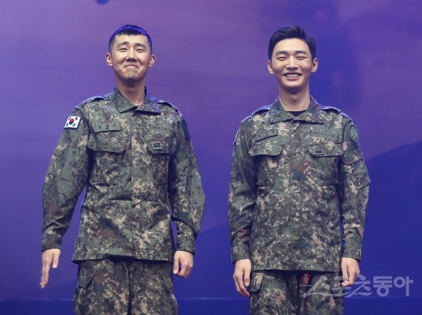 김성규와 윤지성(오른쪽)이 24일 서울 용산구 한남동 블루스퀘어 아이마켓홀에서 열린 2019 육군 창작 뮤지컬 ‘귀환’ 프레스콜에서 포토타임을 갖고 있다.