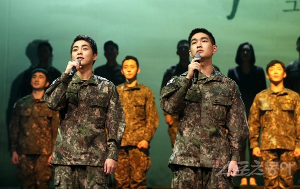 김민석(엑소 시우민)과 이진기(샤이니 온유)가 24일 서울 용산구 한남동 블루스퀘어 아이마켓홀에서 열린 2019 육군 창작 뮤지컬 ‘귀환’ 프레스콜에서 멋진 무대를 펼치고 있다.
