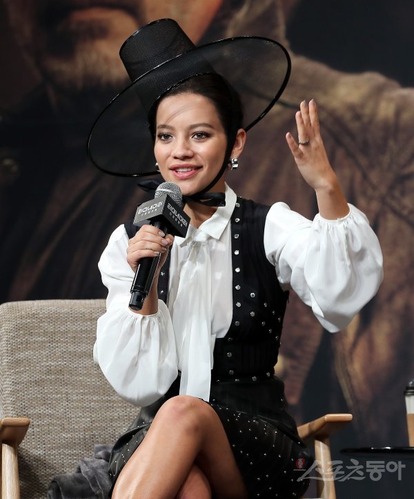배우 나탈리아 레이즈가 21일 서울 종로구 포시즌스 호텔 서울에서 열린 영화 ‘터미네이터 : 다크 페이트’ 내한 기자회견에서 갓을 쓰고 소감을 밝히고 있다.