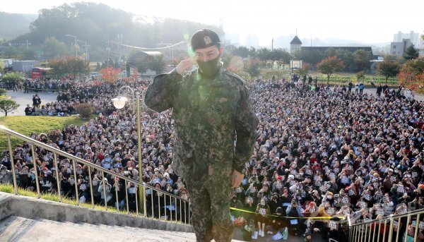26일 경기도 용인시에 위치한 지상작전사령부에서 빅뱅의 지드래곤(권지용)의 전역 행사가 열렸다. 지드래곤이 팬들을 배경으로 기념촬영을 하고 있다.