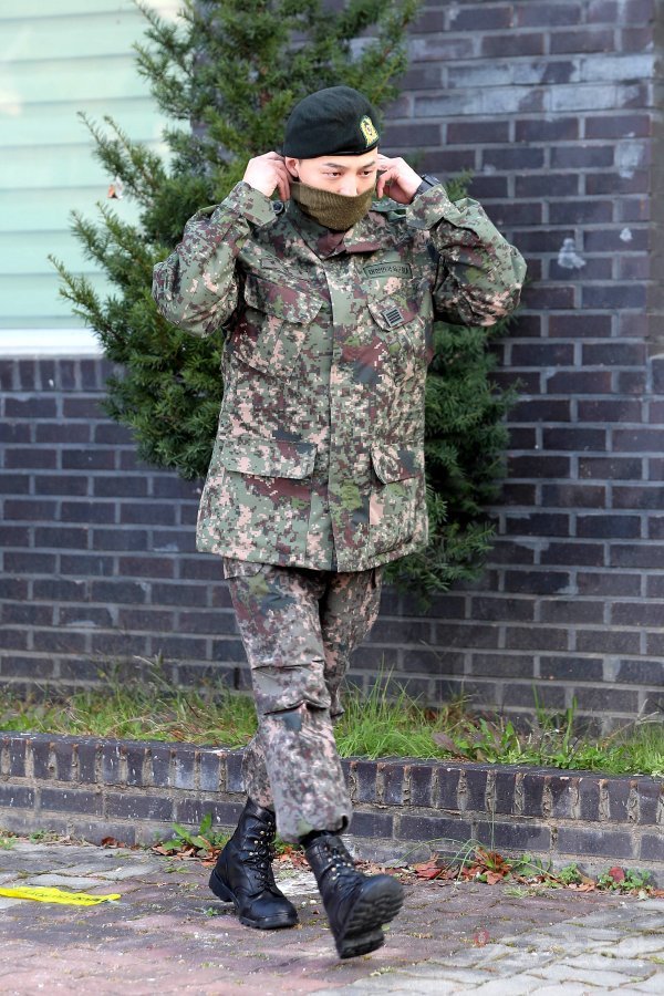 빅뱅의 지드래곤(권지용)이 26일 경기도 용인시에 위치한 지상작전사령부에서 팬들과 취재진 앞에서 전역 인사를 마친 후 차량에 탑승하기 위해 이동하고 있다.