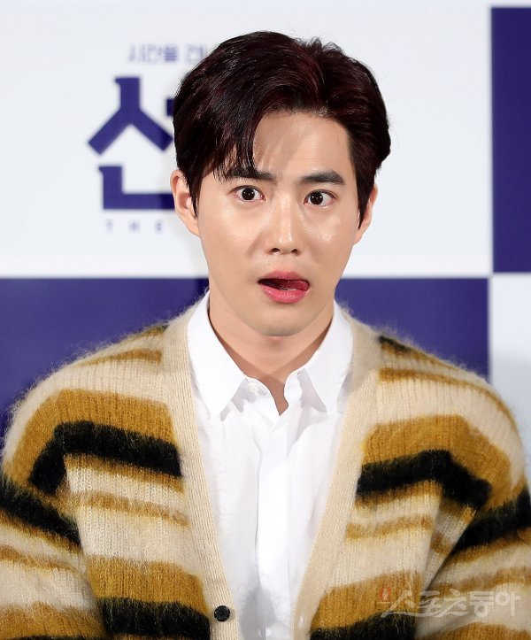 EXO 수호(김준면)가 28일 서울 광진구 롯데시네마 건대입구에서 열린 영화 ‘선물‘ 특별상영회에 참석해 취재진의 질문을 듣는 중 혀를 내밀고 있다.