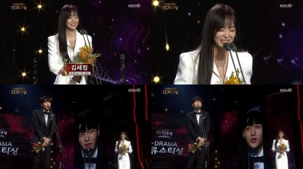 먼저 마이크를 잡은 김세정은 “예쁘고 멋진 곳에서 예쁘고 멋진 말을 듣는 것만으로도 행복했는데 상을 주셔서 감사하다. 많은 분들 앞에서 누가 되지 않는 연기를 하겠다. 수많은 배우들 앞에서 열심히 누가 되지 연기를 하도록 노력하겠다”는 수상소감을 전했다.